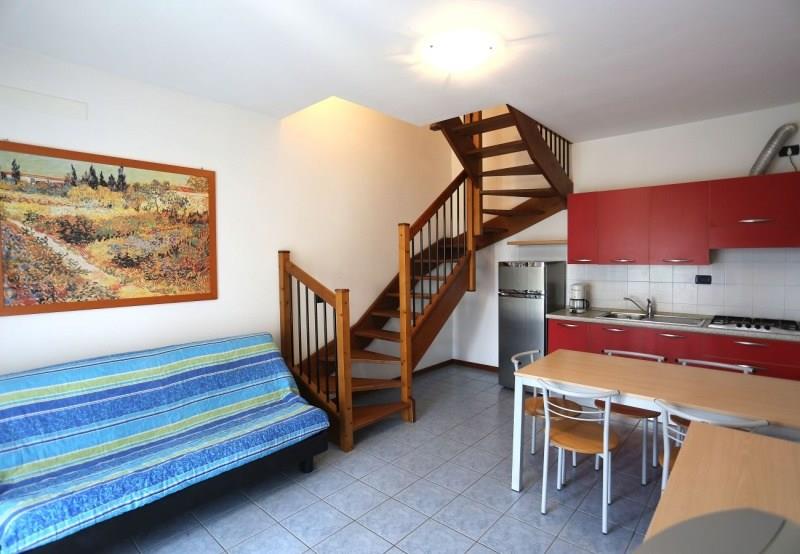 | V5 vilky: (45 m2, max. 5 osob, dvoupodlažní apartmán) v přízemí - denní místnost s rozkládacím dvojlůžkem a kuchyňským koutem, terasa s malou zahrádkou. V patře - ložnice se třemi lůžky, SPR+WC+fén, balkon. |