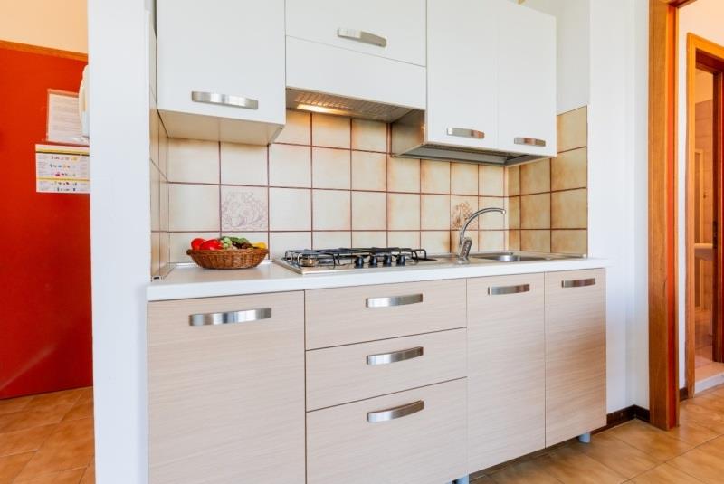 | A4-2: (max. 4 osoby) studio (jedna místnost) se dvěma rozkládacími dvojlůžky (přép. patrové lůžko), kuchyňský kout, balkon, orientace do vnitřního atria. |