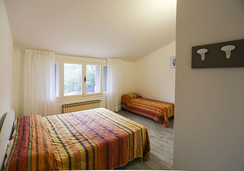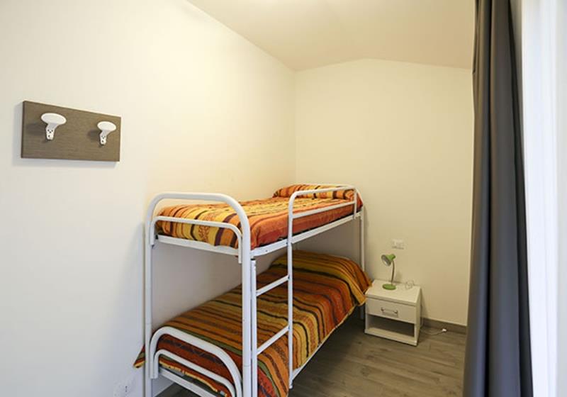 C4: (max. 4 osoby, dvoupodlažní apartmán) přízemí - denní místnost s kuchyňským koutem, terasa. Patro - ložnice se třemi lůžky.