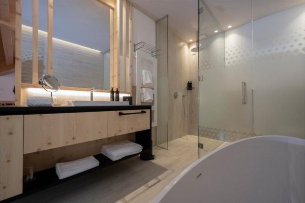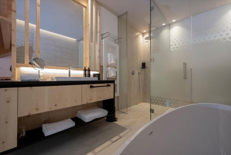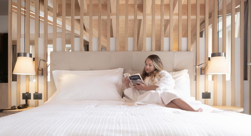 Junior Suite Cima Dodici (pro 2/3 osoby) má vlastní koupelnu s fénem a županem,televize,telefon,WiFi připojení,bezpečný,mini-bar,topení, rozkládací pohovkou a balkonem a terasou s výhledem na hory.