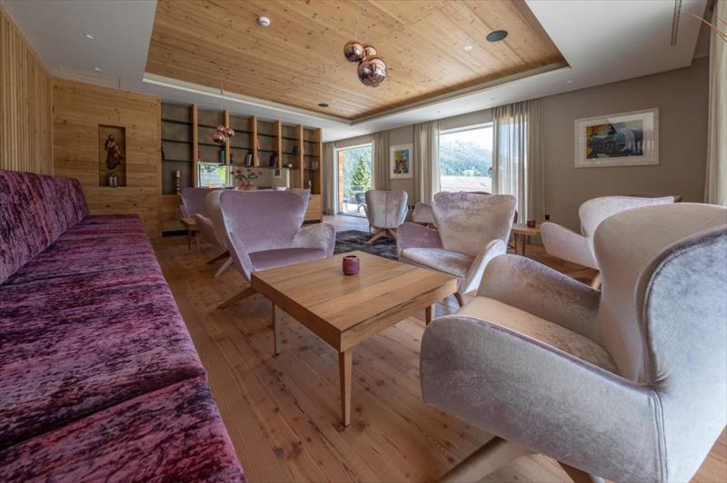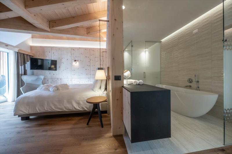 Junior Suite Roda di Vael (pro 2/4 osoby) má parketové podlahy, vlastní koupelna s fénem a županem,televize,telefon,WiFi připojení,bezpečný,mini-bar,topení, set na kávu a čaj a balkon vybavený stolem a židlemi. externí.