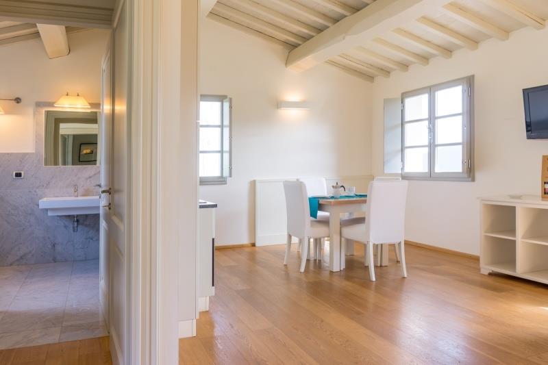 A3 (max. 3 osoby, Olivo): v hlavní budově v přízemí s výhledem na bazén - venkovní veranda vybavená stolem a židlemi, obývací pokoj s kuchyňským koutem, TV, manželskou postelí a rozkládací pohovkou pro 1 osobu, SPR+WC.