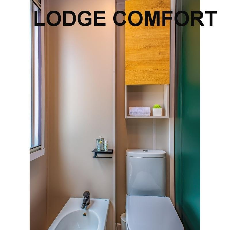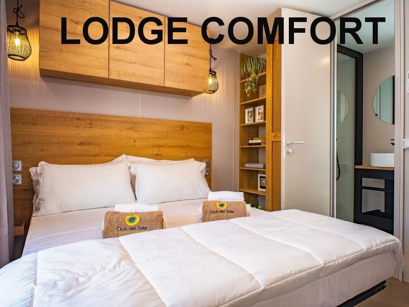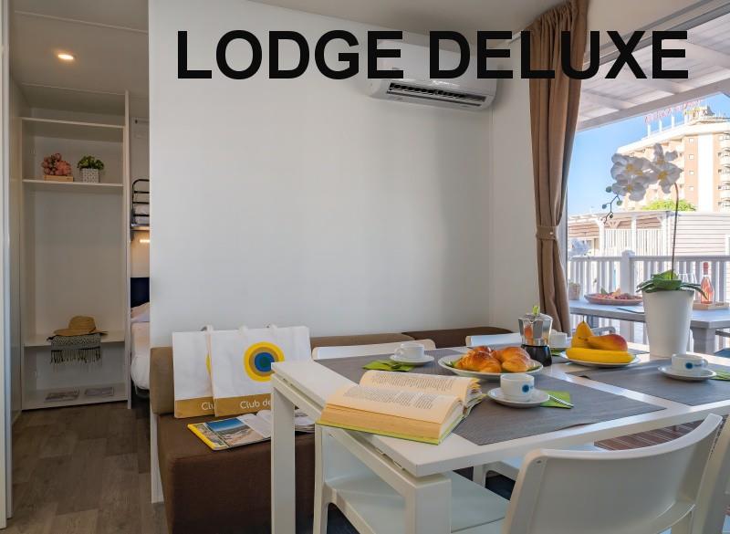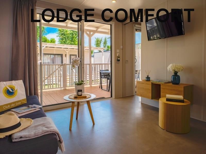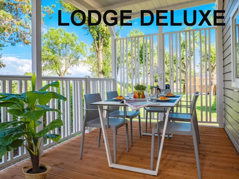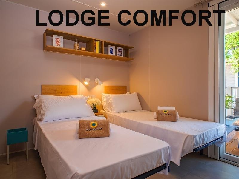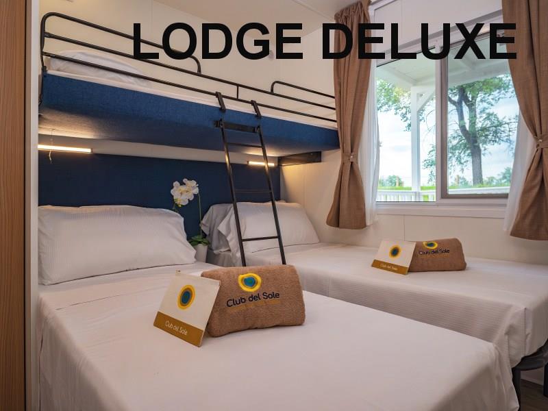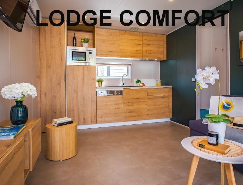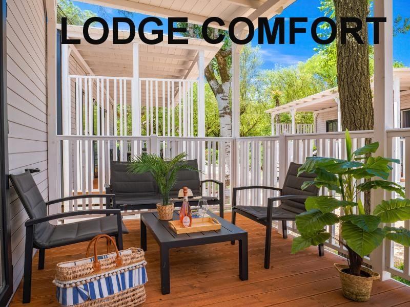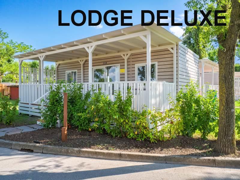 mobilhome LODGE SUPERIOR: (max. 4 osoby, cca 32 m2) ložnice s dvojlůžkem, ložnice se dvěma lůžky, denní místnost s kuchyňským koutem, myčka, mikrovlnka, SPR+WC, veranda. Klimatizace.