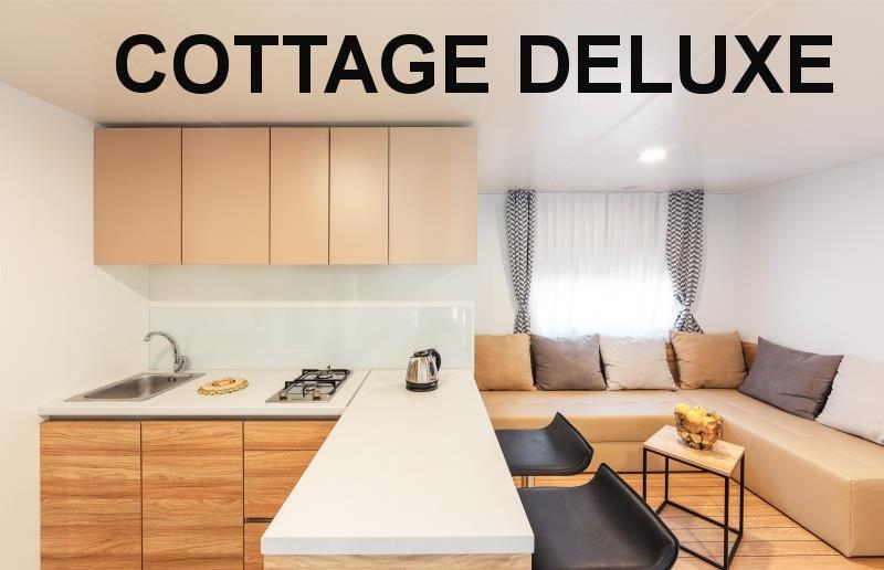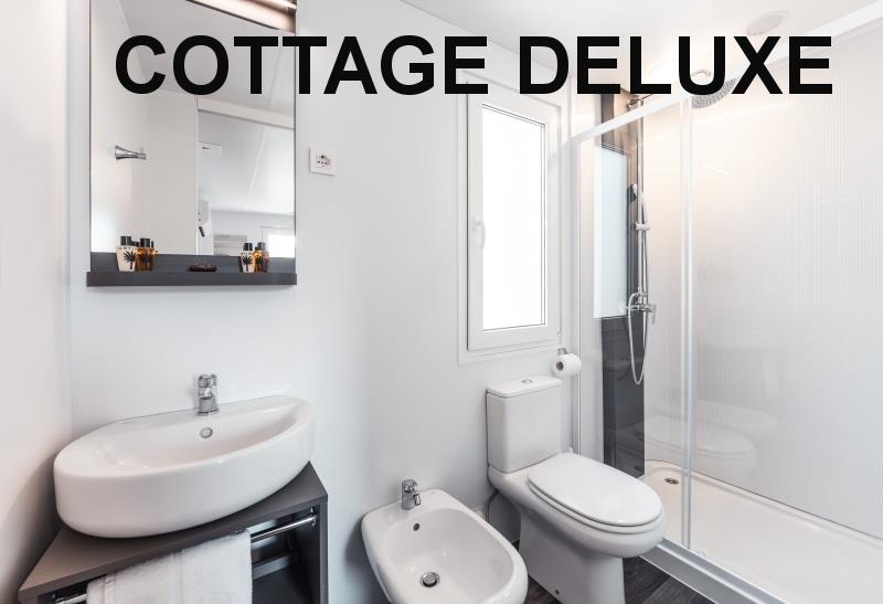 chalet COTTAGE DELUXE MAXI: (max. 4 osoby, cca 33 m2) ložnice s dvojlůžkem, ložnice se dvěma lůžky, denní místnost s kuchyňským koutem, myčka, 2x SPR+WC, terasa.