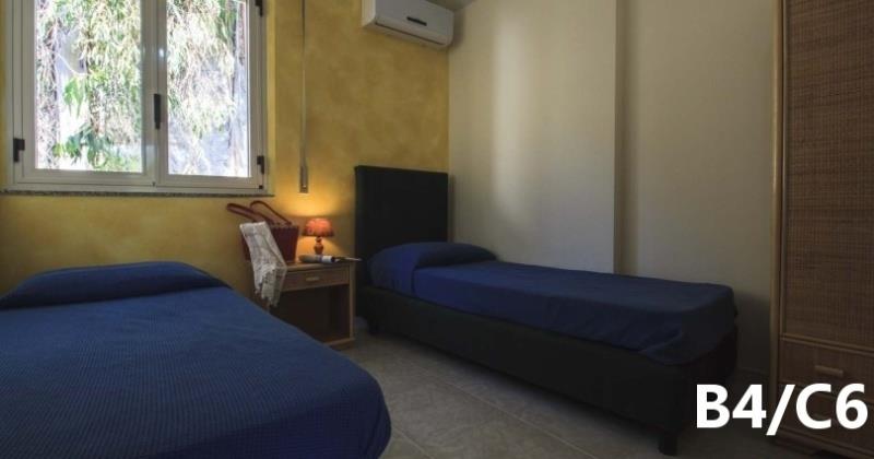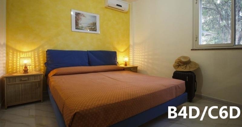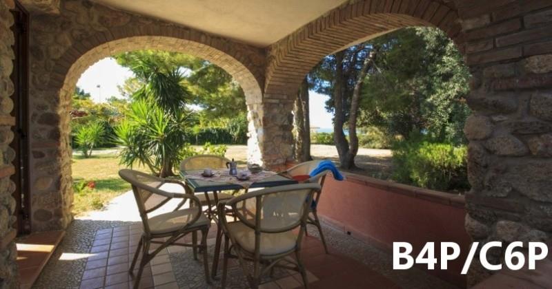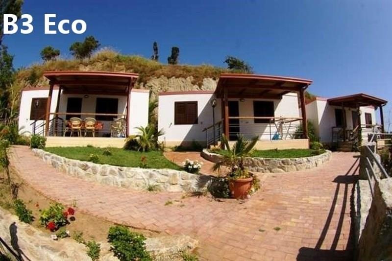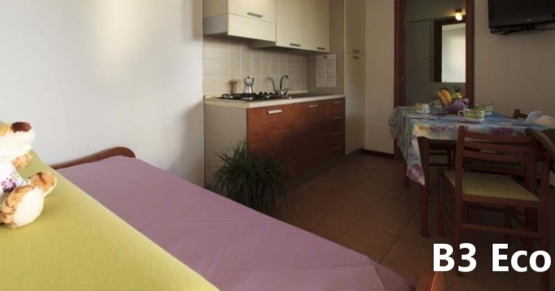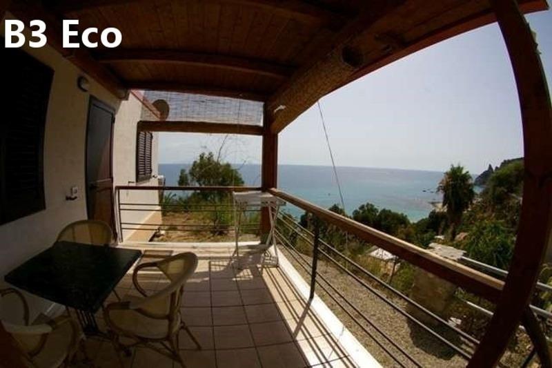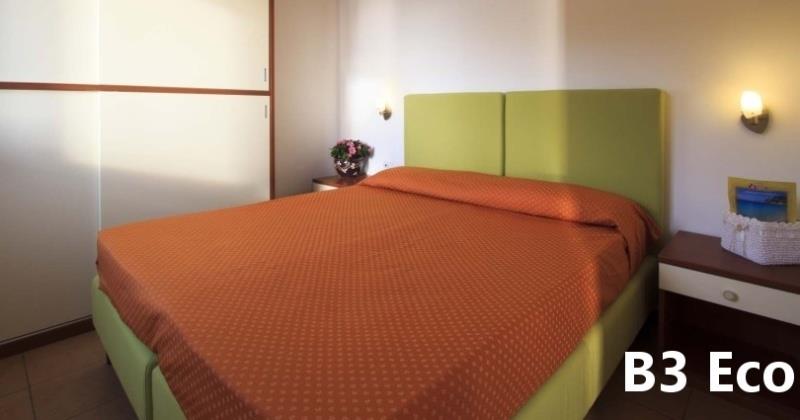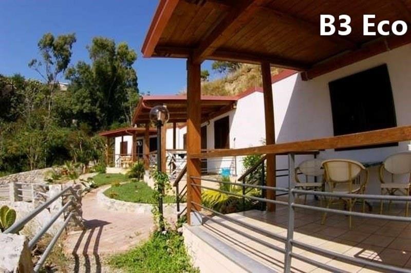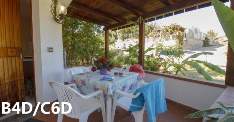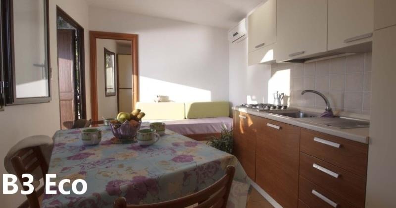 B3 ECO CASA: (max. 3 osoby) ložnice s dvojlůžkem, denní místnost s rozkládacím lůžkem a kuchyňským koutem, SPR+WC, fén, TV/SAT, klimatizace, veranda se zahradním nábytkem, výhled na moře.