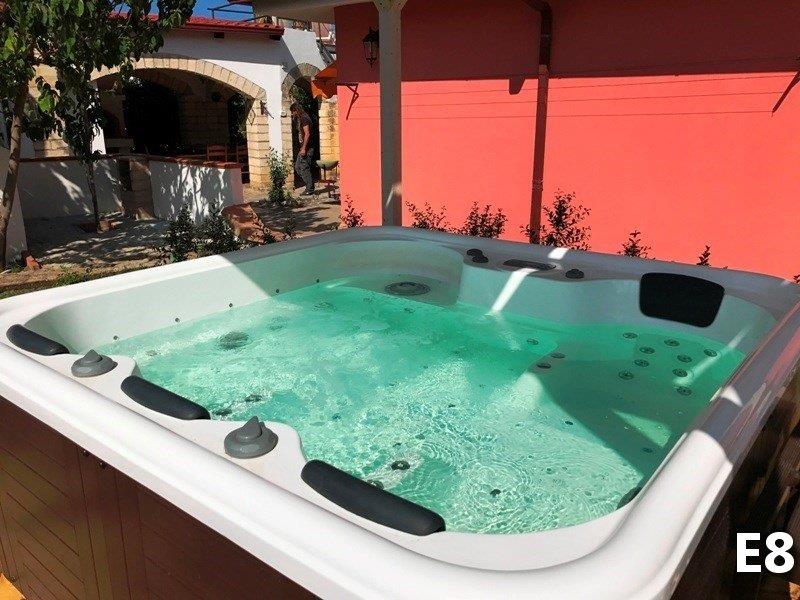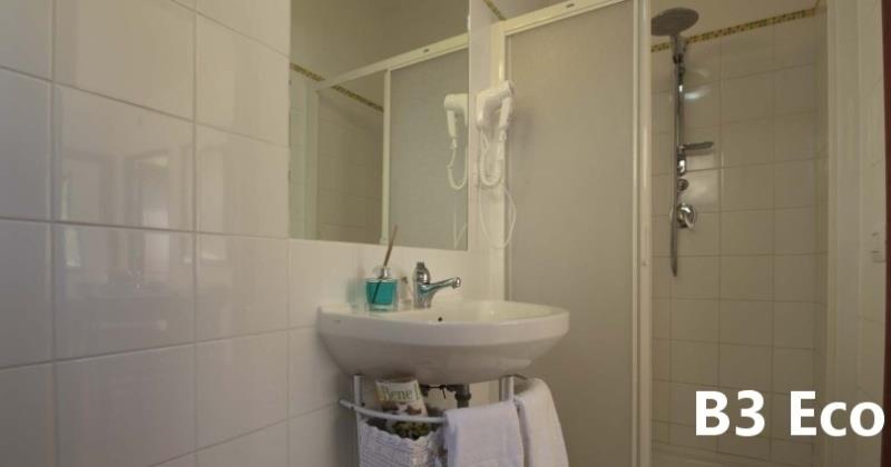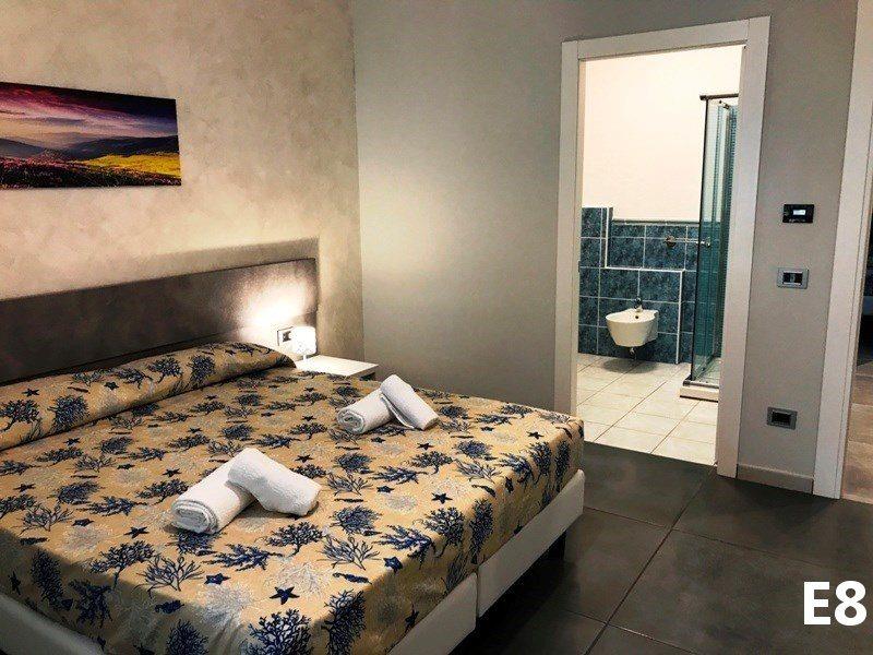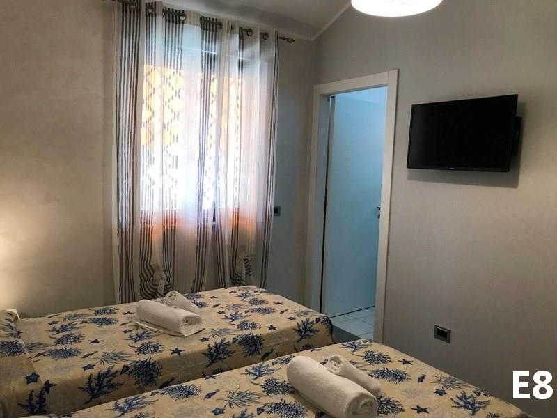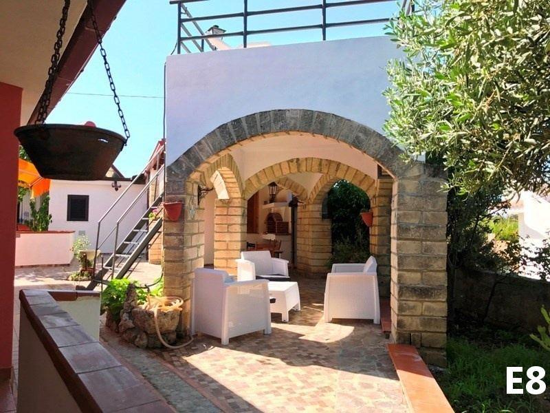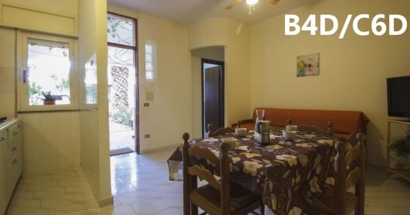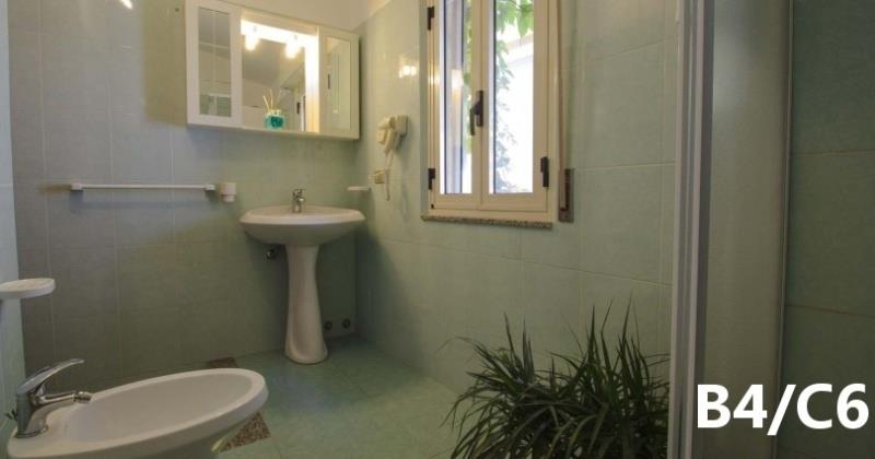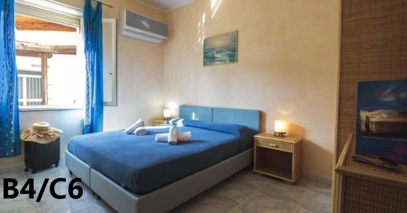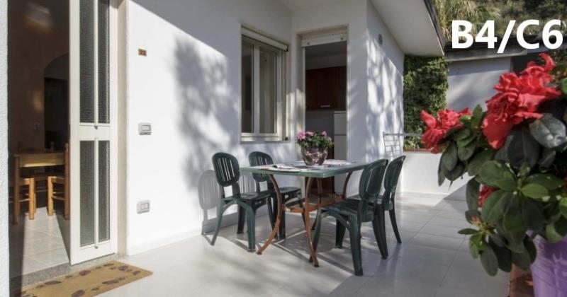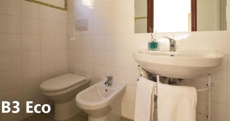 B3 ECO CASA: (max. 3 osoby) ložnice s dvojlůžkem, denní místnost s rozkládacím lůžkem a kuchyňským koutem, SPR+WC, fén, TV/SAT, klimatizace, veranda se zahradním nábytkem, výhled na moře.