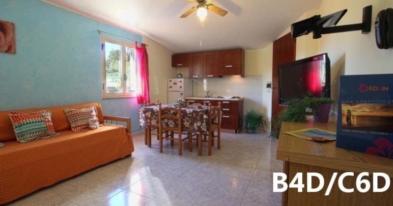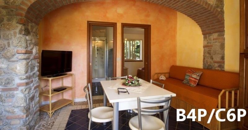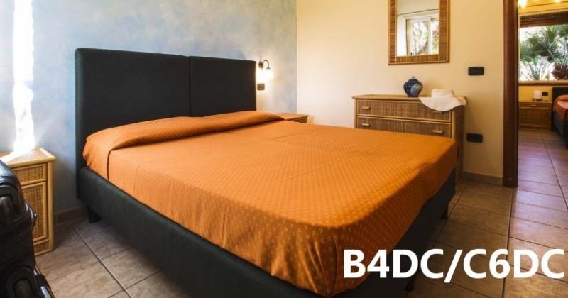 B4D: (max. 4 osoby) depandance - ložnice s dvojlůžkem, denní místnost s rozkládacím dvojlůžkem a kuchyňským koutem, SPR+WC, fén, TV/SAT, klimatizace, veranda se zahradním nábytkem.