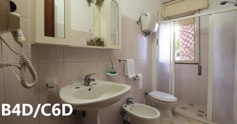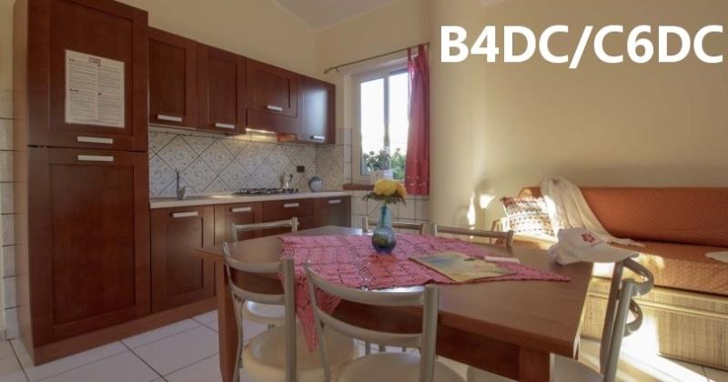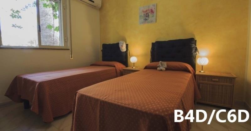 C6D: (max. 6 osob) depandance - dvě ložnice po dvou lůžkách, denní místnost s rozkládacím dvojlůžkem a kuchyňským koutem, SPR+WC, fén, TV/SAT, klimatizace, veranda se zahradním nábytkem.