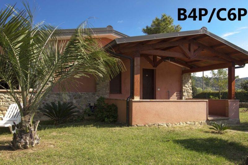 B4P: (max. 4 osoby) panoramatický - ložnice s dvojlůžkem, denní místnost s rozkládacím dvojlůžkem a kuchyňským koutem, SPR+WC, fén, TV/SAT, klimatizace, veranda se zahradním nábytkem.