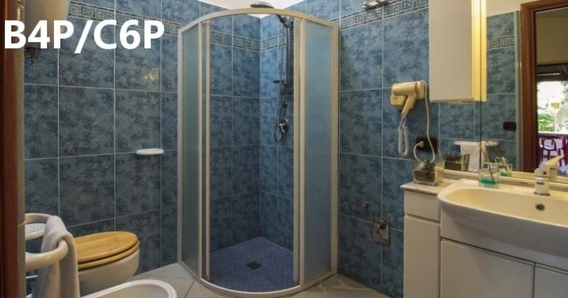 C6P: (max. 6 osob) panoramatický - dvě ložnice po dvou lůžkách, denní místnost s rozkládacím dvojlůžkem a kuchyňským koutem, SPR+WC, fén, TV/SAT, klimatizace, veranda se zahradním nábytkem, výhled na moře.
