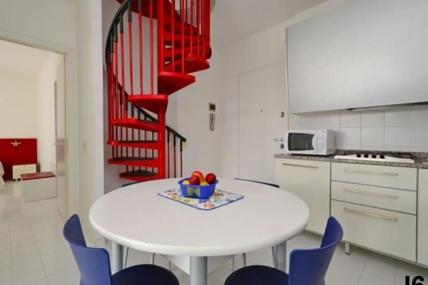 I7: (max. 7 osob) v 1. patře – apartmán ve dvou podlažích – v nižším podlaží - denní místnost s kuchyňským koutem a rozkládacím dvojlůžkem, ložnice s dvojlůžkem a jedním lůžkem, SPR+WC, balkon, ve vyšším podlaží - ložnice s dvojlůžkem, SPR+WC.