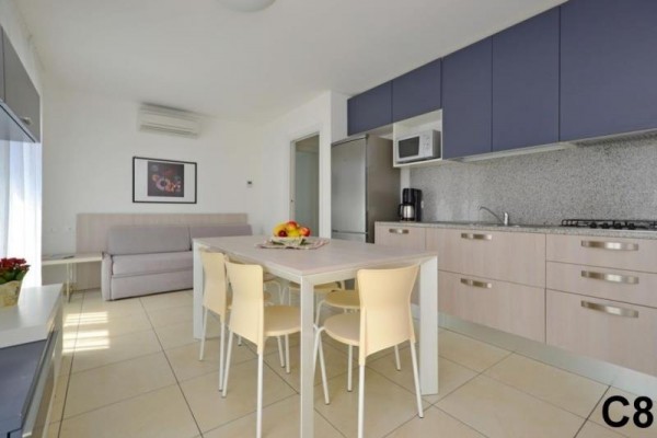 C8: (max. 8 osob) dvě ložnice po třech lůžkách, denní místnost s rozkládacím dvojlůžkem a kuchyňským koutem, balkon.