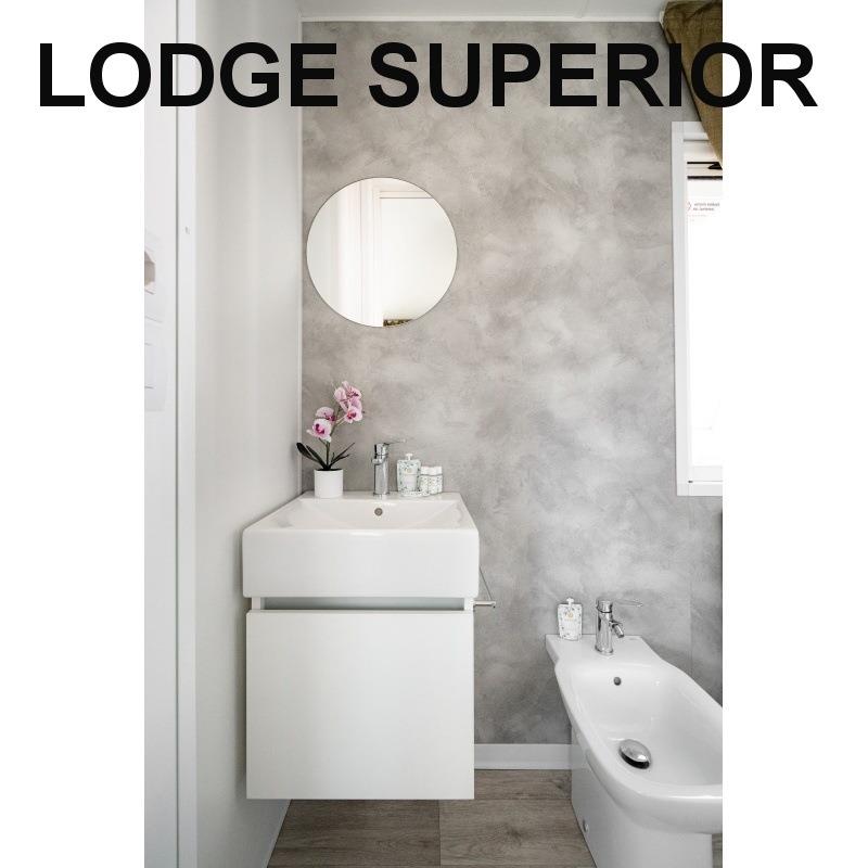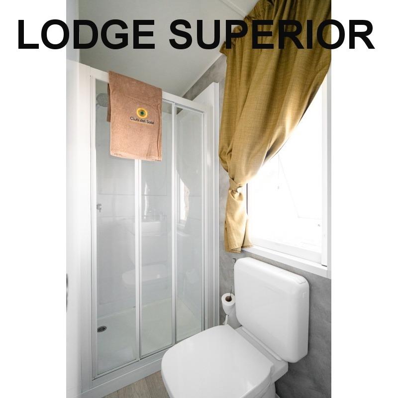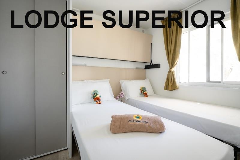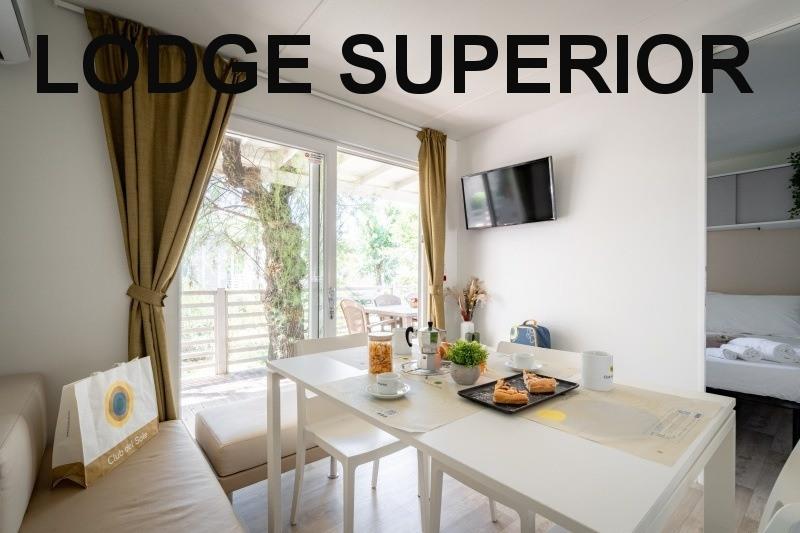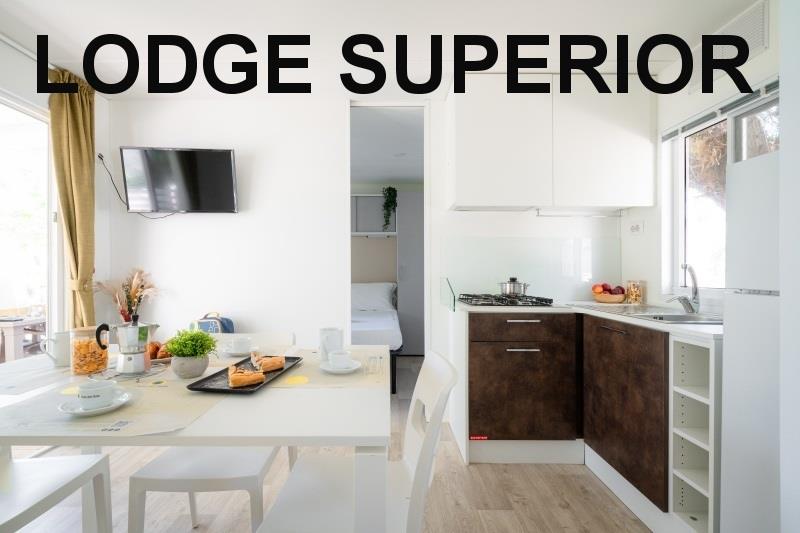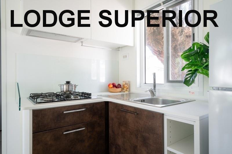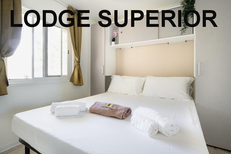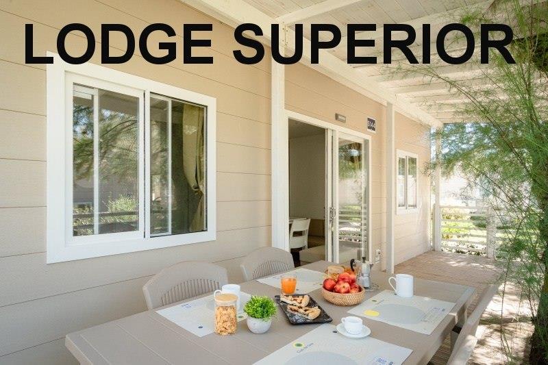 mobilhome Lodge Superior: (max. 4 dospělí + 1 dítě do 10 let,140 cm/ 40 kg, 32 m2) ložnice s dvojlůžkem, ložnice se dvěma lůžky a nad nimi patrová postel (vhodné pro děti, je kratší), denní místnost se sedacím koutem a kuchyňským koutem, 2x SPR+WC, klimatizace. Částečně krytá dřevěná terasa s posezením, terasa je uzavřená dvířky. Možný pobyt se psem.