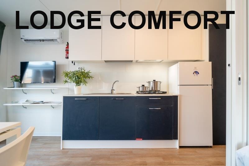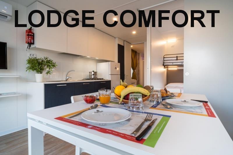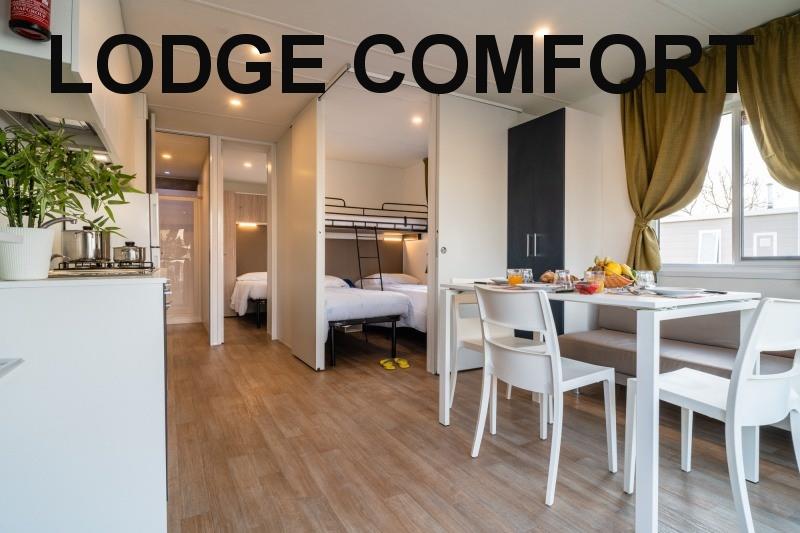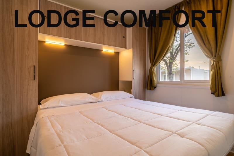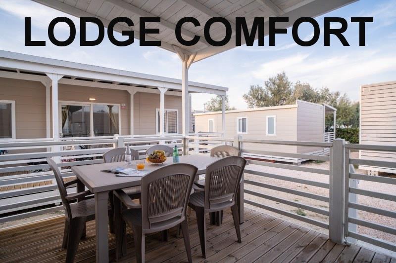 mobilhome Lodge Comfort: (max. 4 dospělí + 1 dítě do 10 let,140 cm/ 40 kg, 29 m2) ložnice s dvojlůžkem, ložnice se dvěma lůžky a napříč s patrovým lůžkem (vhodné pro děti do 10 let, je kratší), denní místnost se sedacím koutem a kuchyňským koutem, SPR+WC, klimatizace. Krytá dřevěná terasa s posezením.