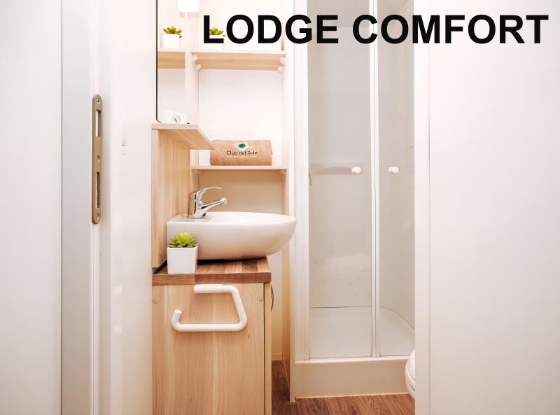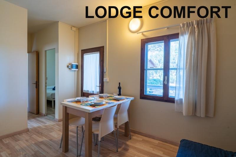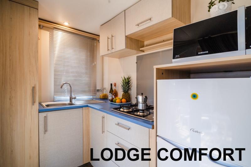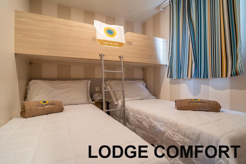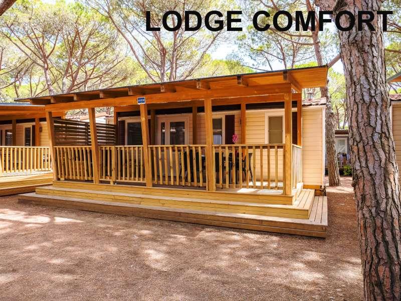 mobilhome Lodge Comfort Plus: (max. 5 osob+1 dítě do 10 let/ 40 kg, 30 m2) ložnice s dvojlůžkem, ložnice se dvěma lůžky a nad nimi patrová postel (vhodné pro děti, je kratší), denní místnost se sedacím koutem (možnost spaní pro 1 osobu) a kuchyňským koutem, SPR+WC, klimatizace (50 hodin v ceně). Částečně krytá dřevěná terasa s posezením, terasa je uzavřená dvířky.