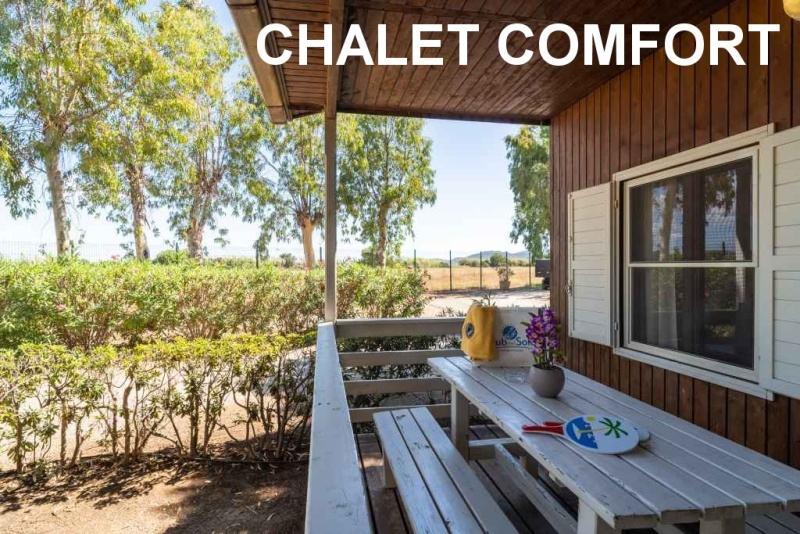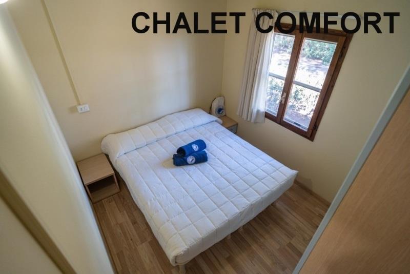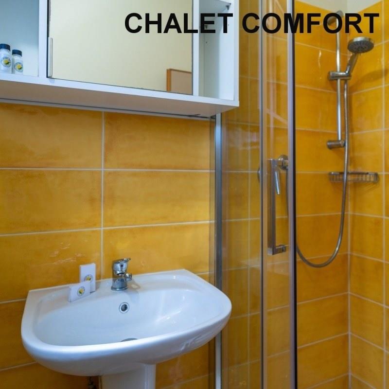 Chalet comfort: (max. 4 osoby, 36 m2) ložnice s dvojlůžkem, ložnice s patrovou postelí, denní místnost se sedacím koutem a kuchyňským koutem, SPR+WC. Dřevěná terasa se zahradním nábytkem, terasa je uzavřená dvířky.